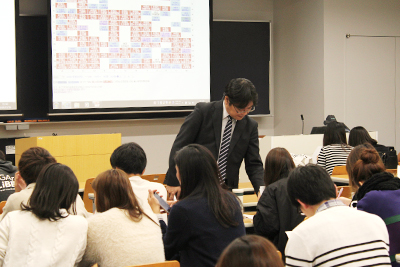 講義の始まりには、前回授業の内容に触れ、学生の理解度を確認しながら進行していた。今回取り上げるテーマに関わる基本的な考え方や会計処理等、学生たちが真剣に聞き入る姿が印象的であった。