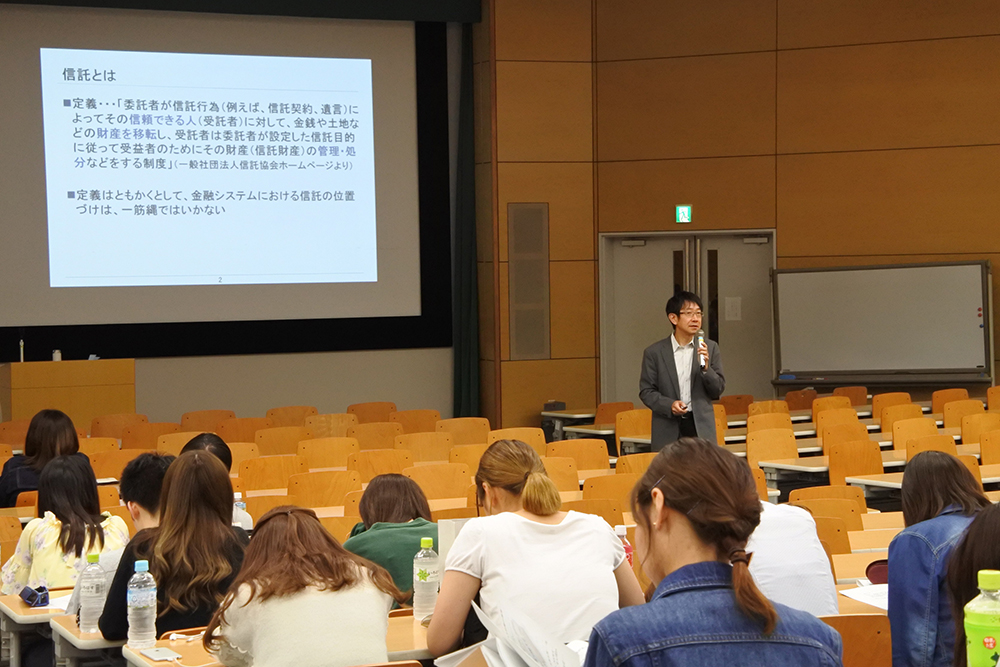 今回の授業は保険業の中の「信託ビジネス」に関する講義であった。講義の冒頭には、保険や生命保険がテーマとなっている映画やマンガの紹介があり、学生にも身近な問題として理解できるように促されていた。その後、「信託とは」という定義の説明がなされ、「信託のしくみ」や「投資信託の流れ」について、図を用いた説明があり、文章や説明だけでは理解が難しい部分を図にすることで、理解度を上げる工夫がされていた。こうした配慮は、学生が復習する際にも理解を深めやすいものであると考えられる。講義の終了後は質問に来る学生も見られ、丁寧な対応がなされていることが見受けられた。