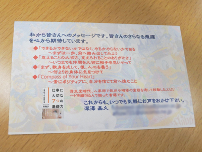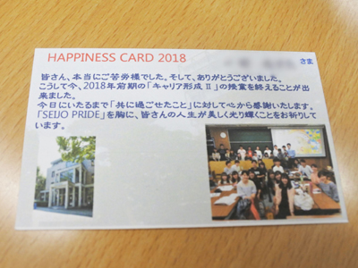 全15回の授業が終了する際、先生からは学生一人ひとりにメッセージカードが配られる。受講学生全員で撮影した写真とともに、今後の学生生活で大切にしてもらいたい志についてのメッセージが書かれている。教員生活を始めてから、ずっと作成されているというこのメッセージカードは、通算で数えきれないほどの数になっている。また、この度インタビューに対応してくれた受講学生たちも、手帳にはさんでメッセージカードを大切に持ち歩いているとのことであった。グループワークと企業の方を相手にしたプレゼンはとても大変ではあるが、自分はできた!やりきった!という自信につながり、カードを見ることでその時の気持ちが沸き上がるとのことであった。その貴重なメッセージカードも、以下に掲載させていただくこととする。