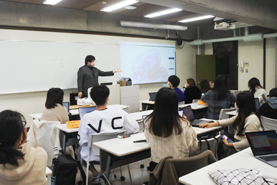 本日はレクチャーの授業であり、テーマである「大企業とアントレプレナー」についての講義が行われた。出席している学生たちは、個々にパソコンやタブレットを机に広げ(※⑤)、先生の講義内容に耳を傾け、懸命にメモを作成していた。