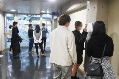 各グループは、言葉の違いを理解したうえで、メモを持ち、7号館4階から地下までをくまなく歩き、手足を使い、利用者の観点から学内施設内にある「ユニバーサルデザイン」と「バリアフリー」を見つける調査を行った。調査中は、活発に意見交換する姿が見受けられた。(※③)また、発見した施設(設備)は、すべての人が不自由なく使えるか、もし、不自由に感じる人物(対象)がいる場合、それはどのような人物(対象)かについて考察しながら実践した。
