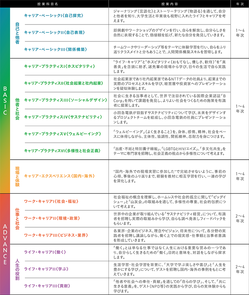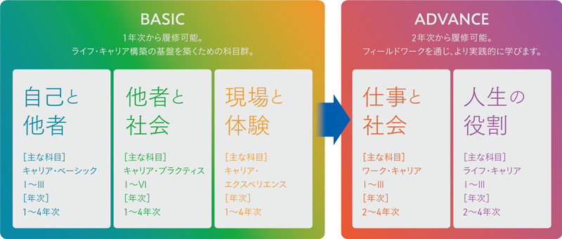 キャリアベーシックⅠ~Ⅲでは、自己と他者を理解し、キャリア・プラクティスⅠ~Ⅵでは社会の関わり方を学び、キャリア・エクスペリエンスでは現場で実践的な経験を積みます。