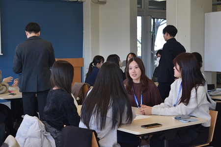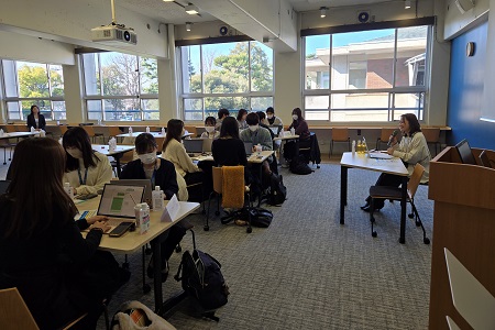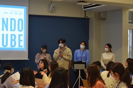 このプログラムは、学部1・2年生を対象に、学生アンバサダーとして企業PRを考える内容となっており、学生たちはチームごとに、企業リサーチや企業担当者へのインタビューを踏まえて発表資料を作成し、企業担当者及び参加者全員にプレゼンテーションを行うという流れで進められました。