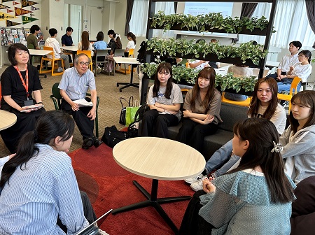 成果発表会には、小田急電鉄の有識者と、学長をはじめ学内教職員、合計8名が来場し、各発表ブースを巡回いただき、問題意識と課題解決について語りあいました。