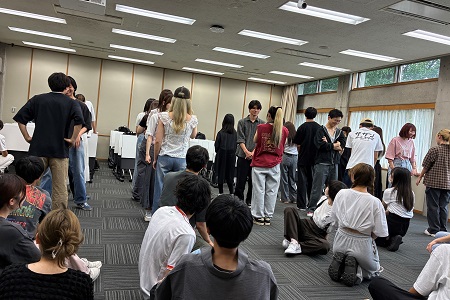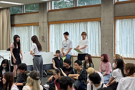「自分とは何者か」「どのように生きていくのか」を考える時期に、同年代の学生たちの前で何らかの表現をすることは、多少の恥ずかしさや緊張感があると思います。そこで、視点を変えて考えることができるように、毎回の授業後の振り返りでは、自分だけではなく他者に対する気づきを考える機会を設けています。こうした自己と他者、そして表現をする側と表現を受け取る側、または相手の表現を引き出す側と全体を俯瞰して観察する側の視点を往復する中で、受講生は「ここでなら発表できそう」、「発表してもみんな受け止めてくれる」、「自分の表現に対してこういうリアクションがあった」という気づきを得ています。