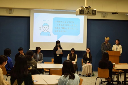 前半のトークセッションでは、「就活の自己分析はどのように行ったのか」「社会人になってから感じた変化や学生時代とのギャップはあるか」など、在学生から事前に寄せられた質問に対して、経験を踏まえて具体的に説明していただきました。