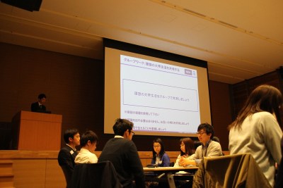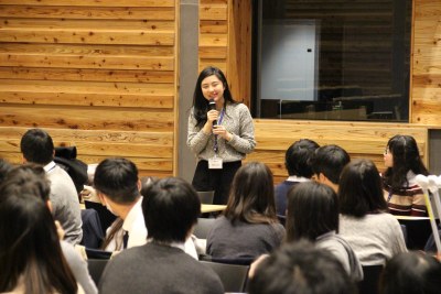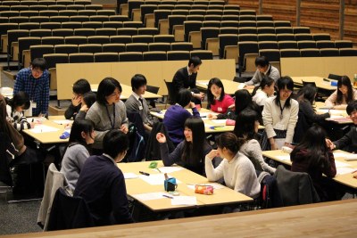 自己紹介や人の話を聞く姿勢など、コミュニケーションの基本を学んだり、実際にテーマを与えてディスカッションも行いました。「プロポーズに指輪はいる?いらない?」というテーマについて、グループごとに議論。「お金じゃない」「一生に一度だから」「渡す場所とかによる?」などさまざまな意見を出し合ってまとめ、みんなの前で発表します。経済学部に進学予定の生徒たちには「会社を経営するにあたってヒト・モノ・カネどれがもっとも重要か?」という少し専門的なテーマを与え「ヒト」や「カネ」を選んだ生徒たちが、堂々と意見を主張する姿に成長の跡が見られました。