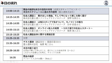就職活動を前にしてどのような心理状態だったか、就職活動に向けて気持ちの切り替えになった出来事、働き始めて気が付いたことや心の変化など、率直な言葉で語っていただきました。質疑応答では、学生から、「文系の学生が理系の企業を目指した理由は?」、「今の会社にエントリーした理由は?」、「学生時代にしておいたほうがいいことは?」などたくさんの質問があり、一つひとつに丁寧に回答していただきました。また、コロナ禍での入社となった社会人1年目の先輩からは、リモートでの業務のメリット・デメリット、今後も続くであろうオンライン上でのコミュニケーションにおける他者との関係構築や自身のアイデンティティの確立など、参考になるアドバイスをたくさんいただきました。