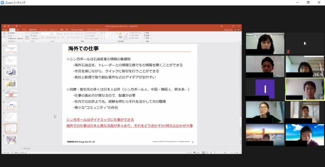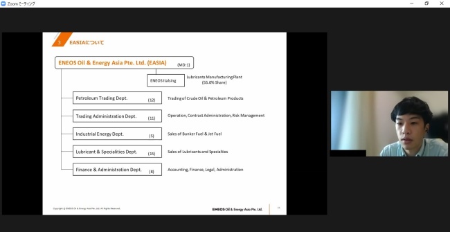 シンガポール支社(ENEOS Oil & Energy Asia Pte. Ltd.)とリアルタイムで中継を行いながら、「トレーディング部門」「潤滑油部門」「産業エネルギー部門」に所属する駐在員の方々から実際の業務内容についてお話を伺いました。
