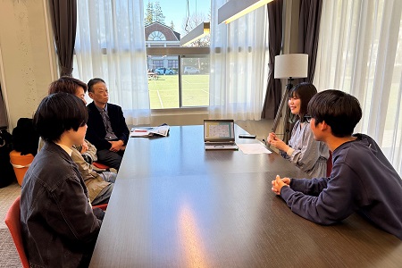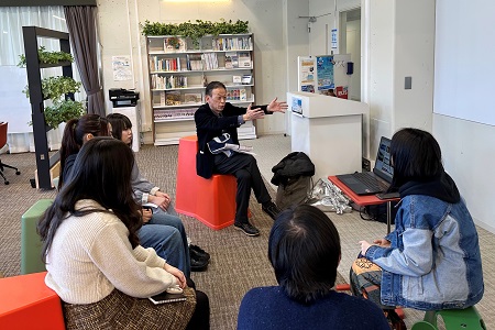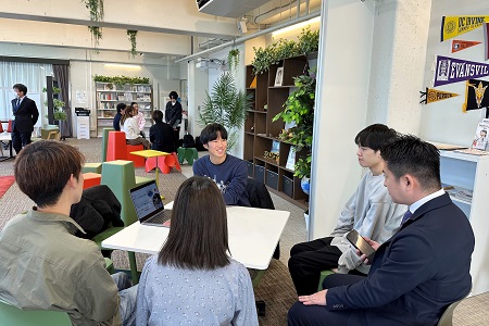 プレゼンテーションは12月22日(金)に、学内グローバルラウンジにて、”屋台村形式3)”で実施しました。当日はNTTデータ岡本氏、森田氏と、本学学長、キャリアセンター長、教職員が各発表ブースを巡回し、それぞれの課題の解決に向けて語りあいました。提案した内容は、会の当日で完結するのではなく、翌回の授業でフィードバックを得て課題を整理し、ブラッシュアップしながら今後に繋げていきます。