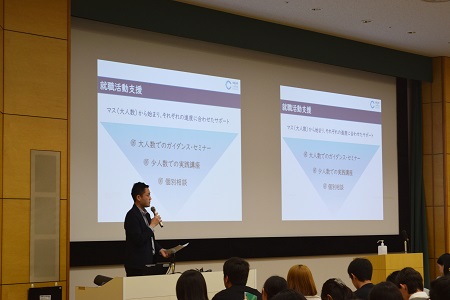 ガイダンスの前半では、キャリアセンターの教職員が、キャリア教育の考え方や「就業力育成・認定プログラム」などを紹介。