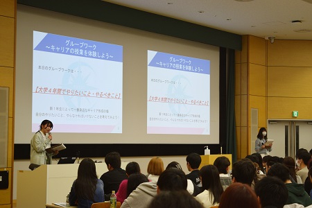 キャリアデザイン科目や正課外プログラムを実際に受講した学生が、「キャリアの授業を体験しよう!」と題して、グループワークを進行。