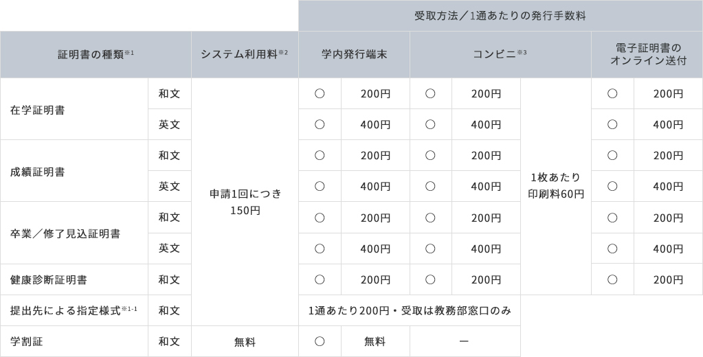 学内発行端末:350円(証明書発行手数料200円、システム利用料150円)