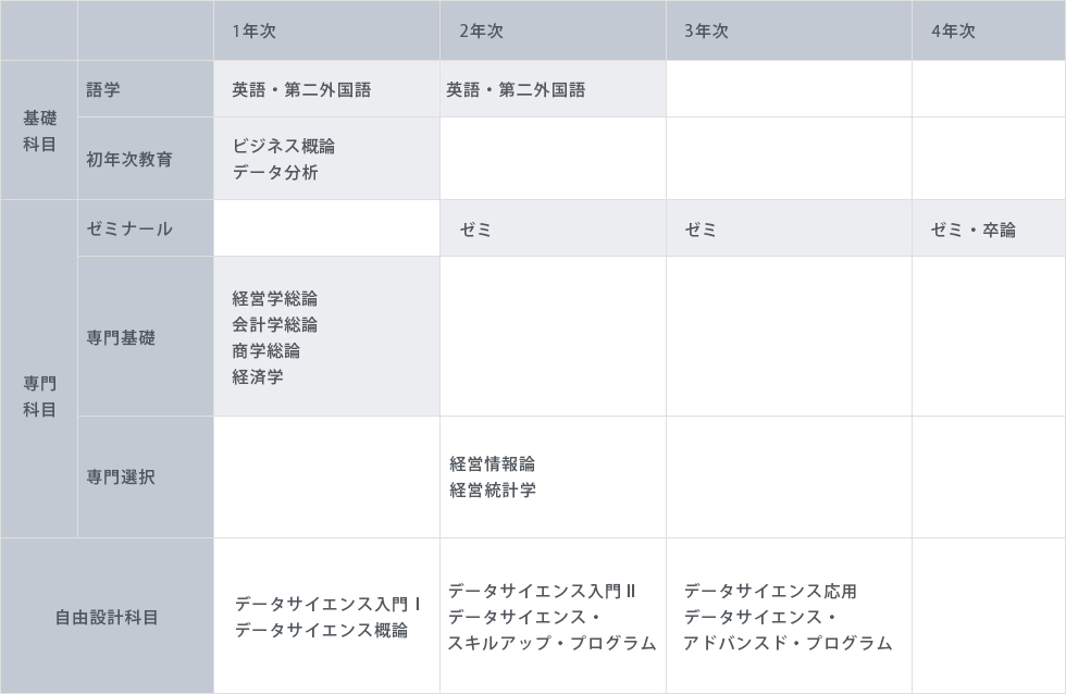2年次前期は、データ解析の基礎を学びます。後期は、いくつかのグループに分かれて、実際にコンピュータを用いたデータの解析を行い、結果をプレゼンテーションします。3年次は、各自テーマを定め、データ収集、解析、考察の一連の作業を行います。4年次は、3年次の内容を発展させて、卒業論文としてまとめていきます。