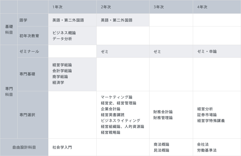 2年次は、経営学や統計学などの基礎を英語の教科書を用いて学習します。サブ・ゼミでは学生諸君の自主研究を行ってもらいます。3年次・4年次での2年間をかけて卒業論文の作成を行います。資料の大部分が英語なので、学習の時間がかなりかかることをあらかじめ理解しておいて下さい。