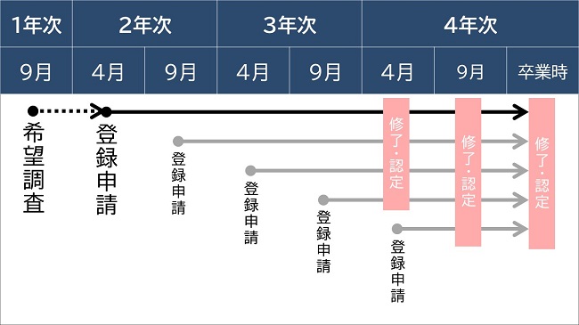 ・2年次に登録を申請しますが、3年次以降も登録申請が可能です。