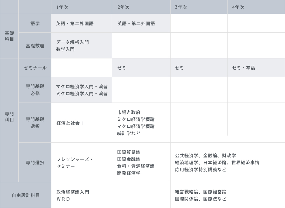 このゼミでは、貿易や直接投資が急速に拡大している世界経済の動きを理解し、世界貿易体制が抱えている問題について議論をすすめていきます。国境を越えて行われる経済取引の動きに注目して、経済学の道具を使って分析することになりますが、まず、世界経済で今何がおきているかを知る必要があります。そこで、2年次のゼミでは、たとえばTPPなど1つのテーマに沿って世界経済情勢を調べ、初歩的な文献を読み進めます。3年次には、国際経済学のテキストなどを読み、経済学的な考え方や批判的に文献を読む力を習得し、4年次の卒業論文につなげていきたいと思います。