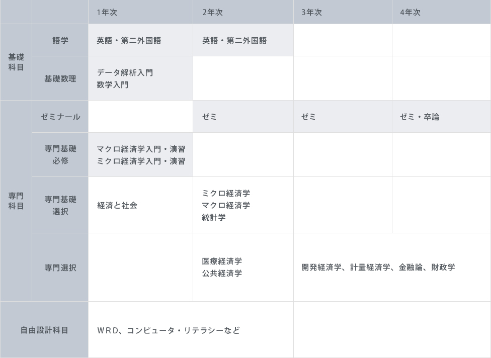 このゼミでは、経済学という分析ツールを身に着け、その経済学の視点から様々な分野を理解するという応用ミクロ経済学のゼミです。このゼミで3年間勉強することにより、学生自身で設定したテーマについて卒業論文を作成し、説得力のある結論を見出すことが目標です。この目標に向かって段階的に学習を進めて行きます。