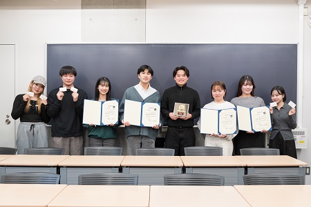 上田ゼミ「Team Green 9」(石野田凪樹さん(4年次)、富田巧海さん、小滝睦さん、笠原那月さん、上西莉里花さん、中村真緒さん、野中聖奈さん、吉富敦人さん(以上、3年次))は、「生物多様性フットプリントと投資家の評価—TNFD開示はネイチャーポジティブに貢献するか?—」というテーマで学術研究分野にエントリーをしました。動画方式の予選会を突破して、対面方式で臨んだ決勝では総合得点が2位となり、「優秀賞」を獲得しました。賞品として「楯」とAmazonギフト券5万円が授与されました。