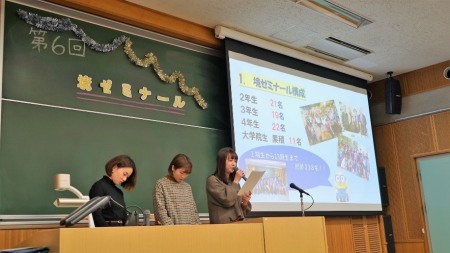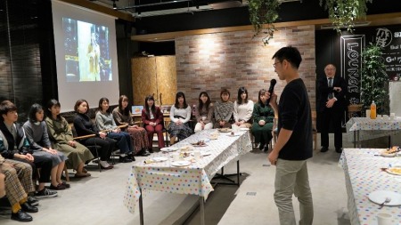 第1部前半では、最初に現役2年生によるゼミ活動報告、次に3年生による第28回経営学合同ゼミナール(境ゼミは最優秀賞を受賞)にて発表した「公共施設の再生と活用」が報告されました。最後に、教員(境)による、教育・研究に関わる近況報告とあわせて、成城商店街PR活動として学生がHPに取材記事(日本語・英語)を掲載している「商店街with成城っ子」の最新状況についても報告されました。