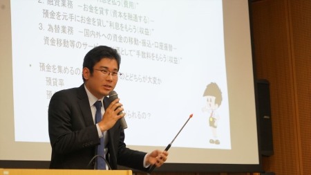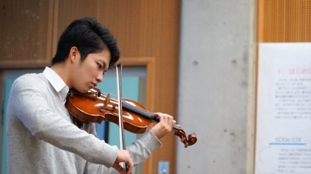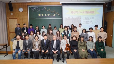 第1部後半では、毎年恒例となっている外部講師による講演会が行われました。今回は、石神直人 氏(ゼミ4期生OB/学部ならびに大学院修了。現在、青木信用金庫 勤務)による演題「金融機関のお仕事」でした。ユーモアを交えた魅力的な語り口、これから就職活動を控えたげ現役生には示唆に富んだ実践的な内容の講演でした。つづいて、余興として2年生で本学・レストロ・アルモニコ管弦楽団に所属している村山司音君による、J.S.バッハほかのヴァイオリン曲が演奏され感動に包まれました。最後には、全員で集合写真が撮影されました。