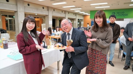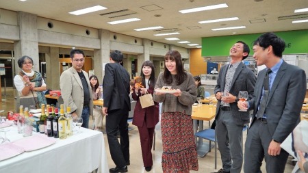 最後に第3部では、再び7号館地下ラウンジに場を移して「懇親会2」が開催され、当月が誕生日でもある教員には花束等が贈られました(サプライズでした)。