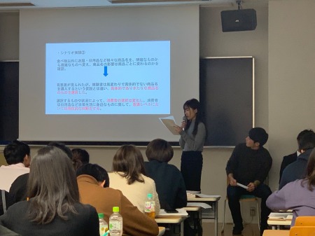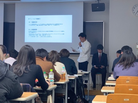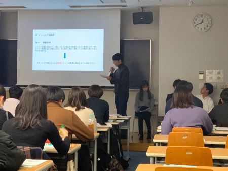 研究報告会は、午後12時30分から18時近くまで行われ、岩﨑ゼミナールからは4チーム、明治学院大学・神田ゼミナールから3つのチーム、相原ゼミナールから3チームがそれぞれ報告を行いました。各ゼミナールのチーム報告後の質疑応答では、フロアーから多くの質問やコメントなどがあり、各チームは適切な受け答えを行うことを通じて、研究内容の理解を深めていました。