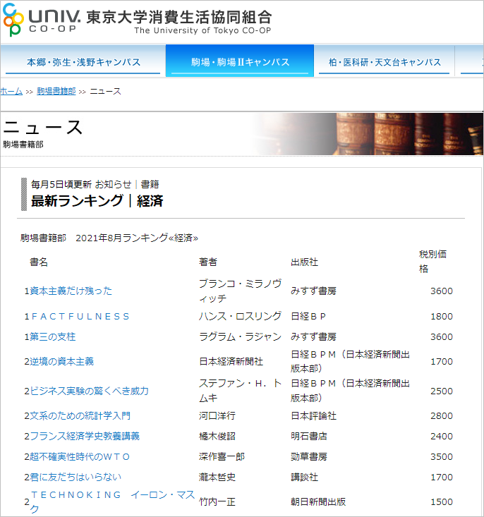 東京大学にある生協駒場書籍部で発表されている書籍ランキングの経済書部門で、経済学部河口教授の「文系のための統計学入門-データサイエンスの基礎」日本評論社が2位になりました。 なお、本書は経済学科1年生が全員履修する「データ解析入門Ⅰ・Ⅱ」において教科書として使用されています。