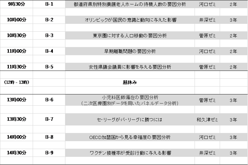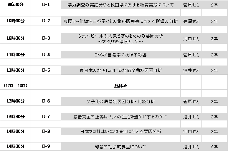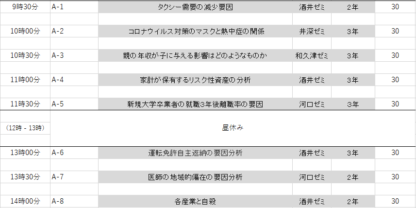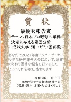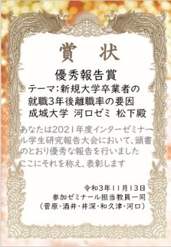 会場ごとに、優れた発表に対して「最優秀報告賞」及び「優秀報告賞」が選考されました。河口ゼミからはA会場の発表において、松下さんの「新規大学卒業者の就職3年後離職率の要因」が優秀報告賞に選出されました。また、D会場の発表において、薗部さんの「日本プロ野球の年棒の決定に与える要因分析」が最優秀報告賞に選出されました。