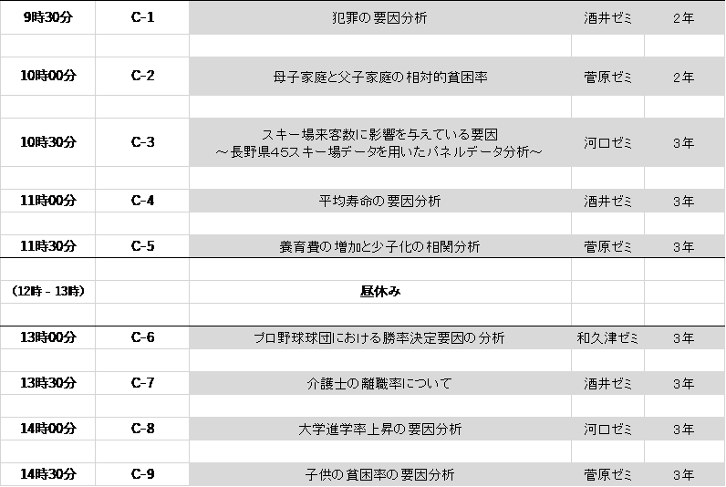成城大学経済学部河口ゼミナールが、11月13日(土)に開催された法政大学・慶応大学及び名古屋市立大学とのインターゼミナール研究報告会に参加しました。この報告会には、法政大学菅原ゼミナール(医療経済学)、法政大学酒井ゼミナール(労働経済学)、慶応義塾大学井深ゼミナール(医療経済学)、名古屋市立大学和久津ゼミナール(医療経済学)、成城大学河口ゼミナール(医療経済学)の5つのゼミナールの学生が参加しました。