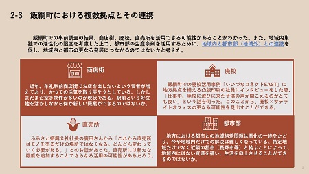 下北沢では,商業施設・文化施設・行政施設の拠点を利用したエリアマネジメントを行っています。それを参考に飯綱町で活用できる拠点を調査した結果,商業施設・文化施設・医療介護施設の連携に可能性を見出しました。現地フィールドワークでは,飯綱町役場・峯村勝盛町長,牟礼駅前商店街代表・小林直樹氏,飯綱町ふるさと振興公社[直売所]代表取締役・廣田裕二氏らにインタビューを行いました。その上で,それらの地域での拠点連携,ならびに,都市部と地域での交差した拠点連携によって人口流出の抑止,地域価値の向上,社会善の実現の可能性を検討してみました。