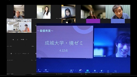 最後に審査結果が発表され,成城大学・境ゼミは最優秀賞に輝きました。境ゼミは,15回目の参加となり,9年連続で受賞しています。先輩(上級生および卒業生)からの成果を継承しつつ6月から準備を開始しましたが,途中,活動の停滞や徹夜作業など例年にない異例の展開もありました。ただ,現地フィールドワークを終えてからは,3年ゼミ生コアメンバーが一丸となってチームワークを発揮して提案書の完成に至りました。今後の教育,研究,就活に大いに役立つものと思われます。
