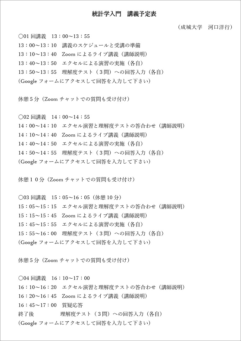 経済学部河口洋行教授が司法研修所の研修の講師を担当しました。司法研修所とは、日本の最高裁判所が設置する、裁判官の研究・修養等を行う組織です。研修に当たっては、統計学の基本的な事項について全4回の講義による研修(表1)を企画しました。当日は、Zoomによるライブ講義やエクセルを使った演習・チャットによる質問や回答に加えて、Googleフォームを使ったミニテストで理解を確認しながら実施しました。参加者は60名近くなりましたが、より専門的な質問が受講生から出るなど、実り多い時間となりました。
