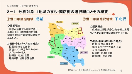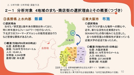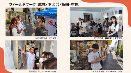 そして具体的に分析対象とする、まち・商店街を、(1)世田谷区成城地区 (2)同・下北沢地区 (3)長野県飯綱町 (4)東大阪市布施地区 の4地域に絞りました。当ゼミでは長年にわたり、成城学園前(商店街理事・加藤小百合 氏)、下北沢(商店街理事長・長沼洋一郎 氏 副理事長・小清水克典 氏)など世田谷区の小田急線・京王線沿線をはじめ、東京都内外の広範囲でまち・商店街に関するフィールドワークを実施してきました。そこに数年来、当研究室と縁の深い長野県飯綱町(峯村勝盛 町長、池内武久 副町長、ふるさと振興公社社長・廣田裕二 氏、飯綱町商栄会会長・小林直樹氏)、そして近年関係を深めている近鉄線沿線にある近畿大学(東京センター事務部長・加藤公代 氏、岡本清文 先生、保本正芳 先生、最寄り駅:長瀬)ならびに布施商店街連絡会(会長・加茂守一 氏、最寄り駅:布施)と行政・東大阪市役所の方々との縁から、東大阪市布施地区も新たにフィールドワークに加わりました。