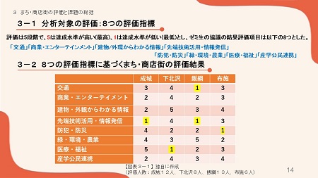調査方法としては、上記地域へのフィールドワークを行い、まち・商店街や直売所、商業施設など主要拠点の現状を観察、検証します。さらに、インタビューおよび公的資料で実態を調査し、その結果をゼミ生が協議して決定した評価指標(8項目)で評価します。その結果として、4地域の特徴と課題ならびに解決策が整理されました。産学公民の印象的な事例としては、飯綱町の都市部との連携事例として、下北沢におけるファーマーズマルシェへの参加、布施商店街とSEKAI HOTEL FUSEがすすめる空き店舗リノベーションと宿泊室活用などがあげられます。