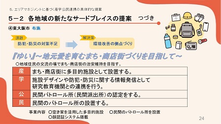 まち・商店街が未来に向けて長く存続するためには、現状を維持するだけでなく、時代の流れに沿って変化し続け、人が集う場所や仕掛けを取り入れて、コロナ禍で希薄になった人と人との繋がりを再構築する必要がある、という問題意識から始めました。そして、未来志向のまち・商店街を作るためにヒト・モノ・カネ・情報の循環を可能にするエリアマネジメントに基づく「産学公民連携」が必要であり、エリアマネジメントの概念を踏まえた産学公民連携を行う場所として新たな「サードプレイス」の提案を行いました。