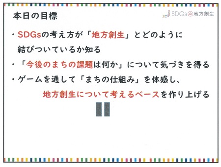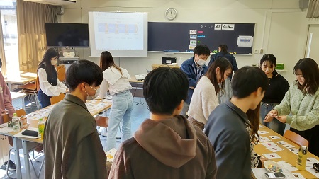 本年12月7日、1号館4階142教室にて経済学部・境新一ゼミでは、持続可能な開発目標(SDGs:Sustainable Development Goals)を体験的に学習できるSDGsカードゲームを実際に体験してみました。17の目標を達成するために、現在から2030年までの道のりを体験できるゲームとして「2030 SDGs」が普及していますが、今回は、SDGsの考え方を基礎として、地方創生における「全体性」「対話と協働」の重要性を体験的に学べる、「SDGs de 地方創生」を行いました。