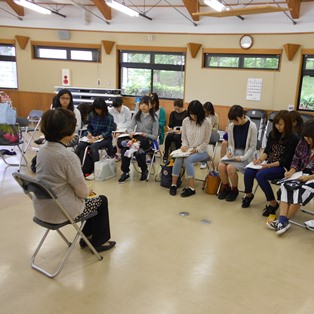 福島県富岡町から避難している被災者の方にお話しを聞きました(2014年9月、福島合宿で)。