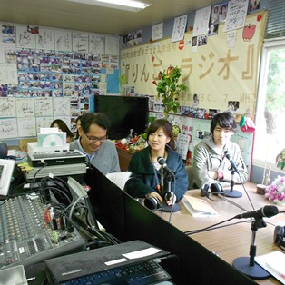宮城県山元町の臨時災害放送局りんごラジオの聴取者調査も行っています。写真は、調査のまえにラジオを通じて協力を呼び掛けているところ(2012年6月、宮城県への調査で)。