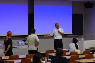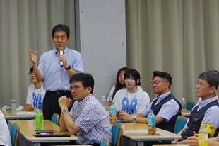 第2部では、山内ゼミナールと小田急電鉄が共同で作成した乗客向け啓発教材を活用した、体験型のワークショップが行われました。まず、小田急電鉄の早川課長より、今回のコラボレーションの企画の趣旨や意義についてお話しいただきました。続いて、山内ゼミナールの学生たちが、教材の狙いや工夫した点について発表し、来場者と直接対話しながら内容の紹介を行いました。