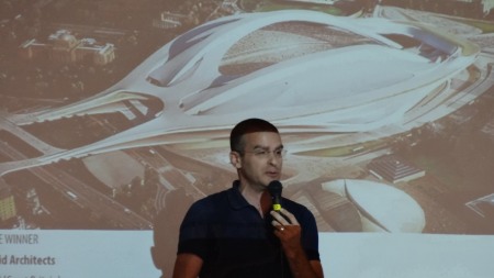 講演では、オリンピック・スタジアム(1964年、2020年)など具体的な建築例のスライドを通して、日本の近代都市建築をめぐる考え方や視点が示され、都市建築が将来どのように展開するかを予想するのがいかに難しいかが説明された。