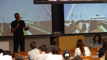 一つの視点は、都市の建築とheritage(過去から未来へと受け継いでいくべきもの)の関係である。これを語るために、講師は2020年オリンピックのメイン・スタジアム案の選考をめぐる物議を紹介した。当初、スタジアム設計選考委員会は、ザハ・ハディドの設計した宇宙船のような先端テクノロジーを強調した高さ最高75mに及ぶ巨大スタジアム案を採択した。ところがこの案はすぐに批判を浴びた。建築費がかかりすぎる。明治神宮の森など周囲の東京のheritageとの調和を欠くなどである。ところがheritage の点では、1964年の東京オリンピックの際には、まさにheritageである日本橋に覆いかぶさる高速道路の建築が許された。また1964年当時、ホテル・オークラなど周囲とそぐわない近代建築が続々とオリンピックに合わせて建設された。にも拘らず、2020年オリンピックのハディド案はheritageとの不調和を理由に排斥され、代わりに隈研吾の設計した案が採択されることになった。これは高さが25mと低く目立たず、建築費も安く、さらにはコンクリートよりも木を多用するところに特徴があり、これが地場に根差した「日本的な」建築でheritageを大切にするものと評価されて採択された。