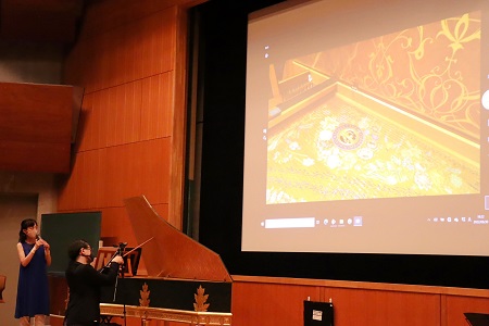 レクチャーは、上下の鍵盤の音色の違いから始まり、17世紀フランスにおける響きの余韻を活かしたチェンバロ音楽、最盛期から終焉へ向かう18世紀後半の重厚でドラマチックな調べなどを参加者たちは生演奏で体感しました。また、プレリュード・ノン・ムジュレという小節線のない前奏曲など興味深い楽譜の紹介や、小型カメラを用いて演奏中の指の運びやチェンバロの内部構造を間近に見る場面もあり、楽器という演奏メディアと楽曲が結ぶ深い関わりについて体験的に学びました。さらに、今回の企画・進行を担当した芸術学科赤塚准教授のヴィオラ・ダ・ガンバとチェンバロの合奏も披露され、音楽学の学びとともに心も豊かになる時間を過ごすことができました。