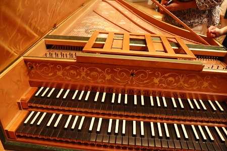 二段鍵盤と美しい装飾が特徴的なチェンバロ(楽器協力:島口ハープシコード工房)