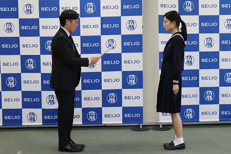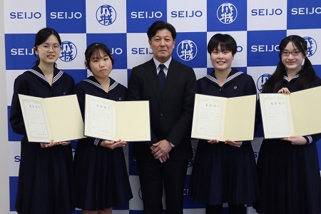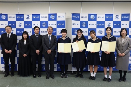 最優秀賞と優秀賞に選ばれた4名の生徒が成城大学に来校し、遠藤学部長より表彰状及び副賞が授与されました。また、課題レポート提出者全員には参加賞も贈呈されました。十文字高等学校の校長先生他複数の教員も来校され、表彰式に立ち会いました。