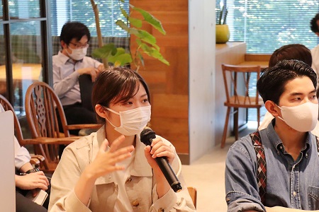 5月17日のグループワークでは、富士通株式会社の方々のサポートにより、行き詰った議論が動き出し、新たなアイデアが生まれる場面も見られました。「悩んだら最初に決めたゴールに立ち戻ること」「解決策ありきの課題設定になっていないか確認すること」など、自らの事業開発の経験を通じたアドバイスは、学生たちにも大きな刺激となったようです。