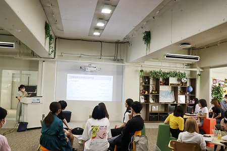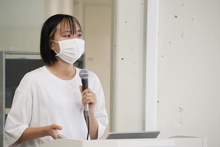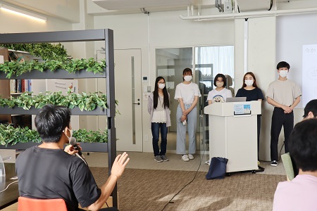 7月からは、授業の集大成として「海外の大学生に社会イノベーション特殊演習を紹介する」という設定で、英語でのプレゼンテーションに挑戦しました。授業内容の紹介に加え、6月に行った提案をブラッシュアップしたもの、そしてこの授業を通して得た力について、それぞれのグループが5分間の発表を行いました。この授業で学んだこととして、根拠データの探し方やビジネスにおける考え方といったスキルに加え、多くのグループがコミュニケーションやチームワークの大切さをあげていたことが印象的でした。発表後は英語で質疑応答も行われ、学生同士で「一番面白かった点は?」「難しかったところは?」など意見を交換しあいました。教員からの総評では、「ビジネスの視点だけでなく、歴史などさらに大きな視点からも考えを深めていってほしい」「できるだけレジュメを見ずにジェスチャーも交えてプレゼンすることを目指してほしい」といったコメントがありました。