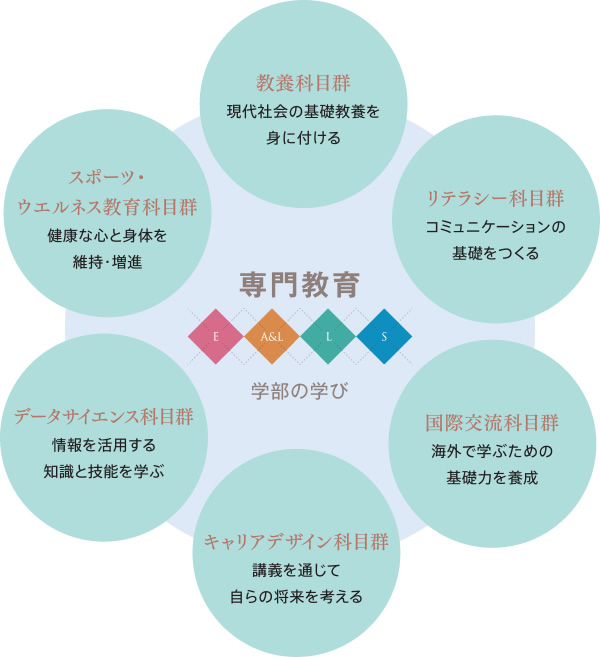 広い領域の教養はもちろんのこと、現代社会に必要なリテラシーも身に付けられる科目を開設し、学部の専門科目と並行して履修することで、総合的な「人間力」を養成します。