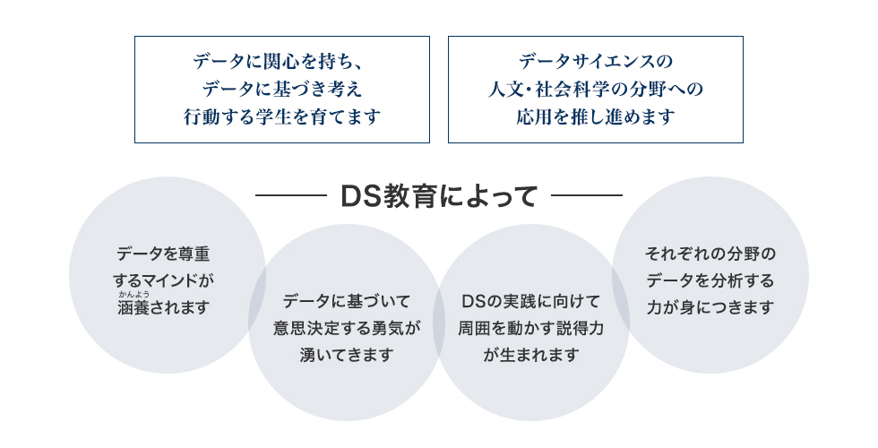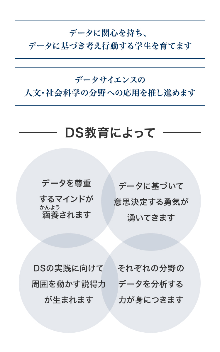 人文・社会科学系の4学部からなる成城大学においても、数理科学のリテラシーを持ち、データ分析に詳しい人材の育成は教育目標の大きな柱の一つです。それぞれの分野の専門知識に加えて、データサイエンスの視点を兼ね備えた、次世代の社会を担う人材を育成します。