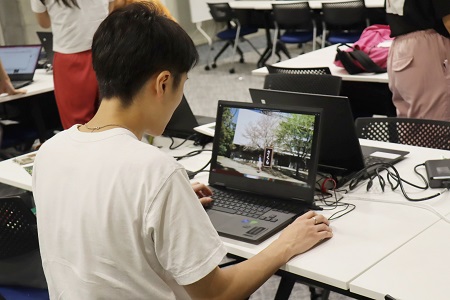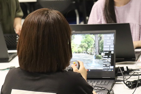 約2か月間の取り組みを経て、作品(3次元デジタル空間とコンテンツ)が完成。7月9日(火)の授業では、オープンキャンパスでの展示・紹介に向けて、アバターを動かしながら空間とコンテンツの最終確認を行いました。作品を完成させた学生たちは嬉しそうな笑顔を見せながらも、アバターの動きなど気になる点を相談しながら手直しや微調整を行っていました。